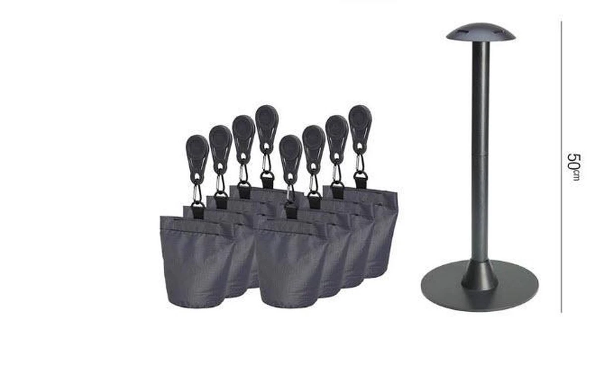 Aerocover Hoessteun is uitermate geschikt voor het afwateren van de afdekhoes. Het paaltje is hoogte 50cm waardoor de hoes goed strak staat. De steunset wordt geleverd inclusief 8 zandzakjes die doormiddel van een klemmetje aan de hoes gemaakt kunnen worden. Dit zorgt voor extra gewicht aan de hoes zodat deze niet door de wind opgetild kan worden.