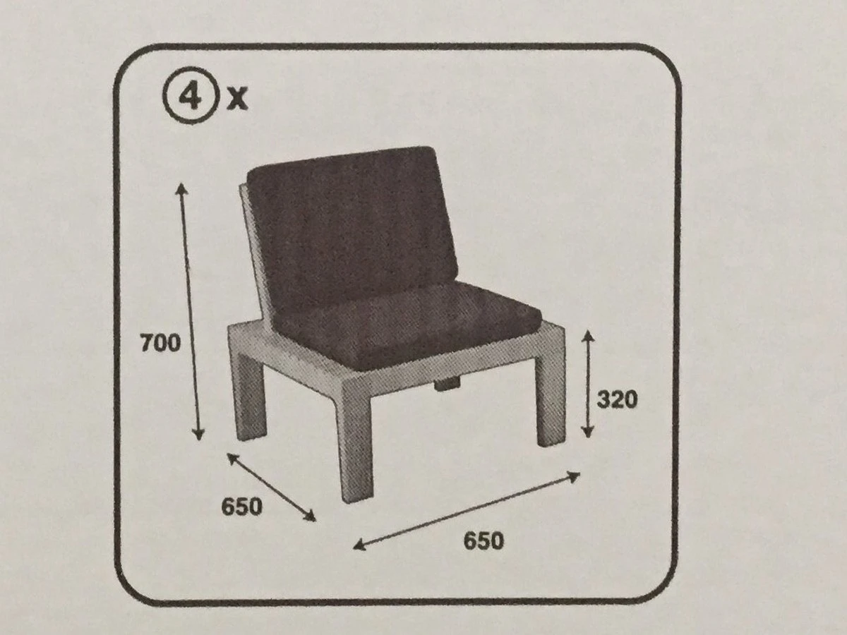 | Verpakkingsinhoud | 4 Zitelementen 1 Tafelelement 4 Zitkussens 4 Rugkussens |